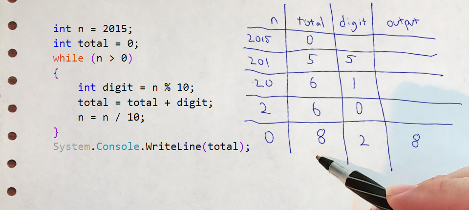 But here’s the thing - we know his computer code. So, without even using a computer, we could figure out what he does just by tracing the the code by hand, keeping a tally of the variables on paper.