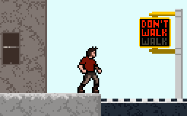 The human doesn’t know he’s in a computer. He just reacts to the world around him like you or I. This is a picture of him waiting at a crosswalk.